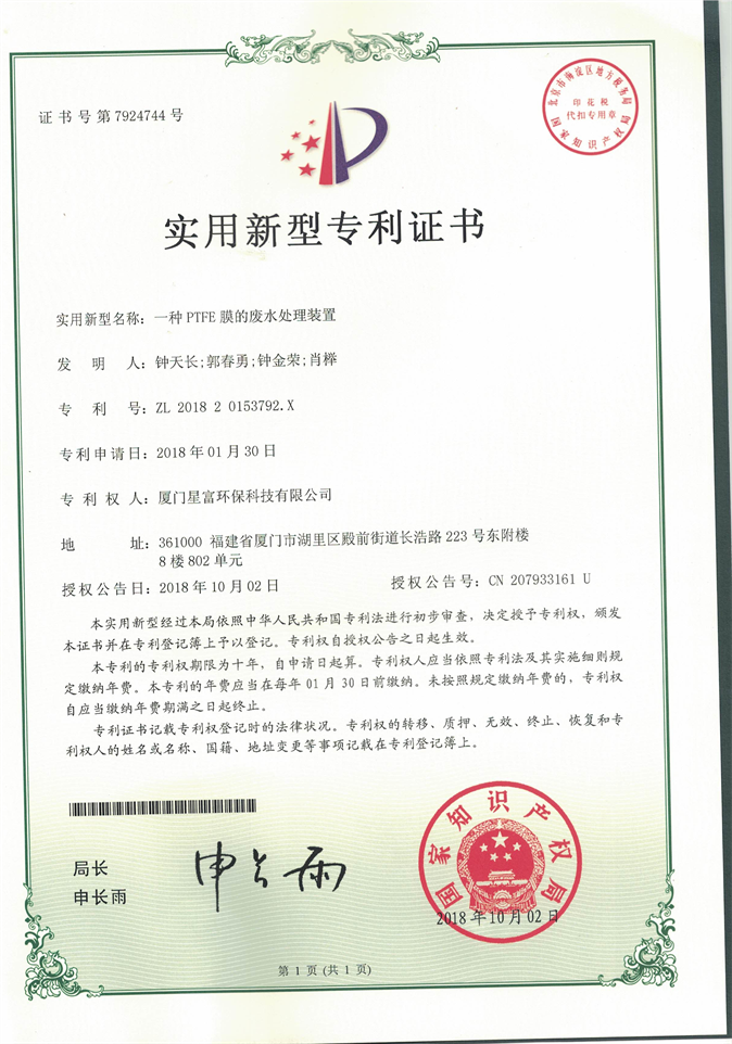 我司關(guān)于一體化PTFE-MBR系統(tǒng)污水處理設(shè)備已經(jīng)申請(qǐng)相關(guān)專利,并取得證書:一種PTFE膜的廢水處理裝置,專利號(hào)為ZL 2018 2 0153792.X